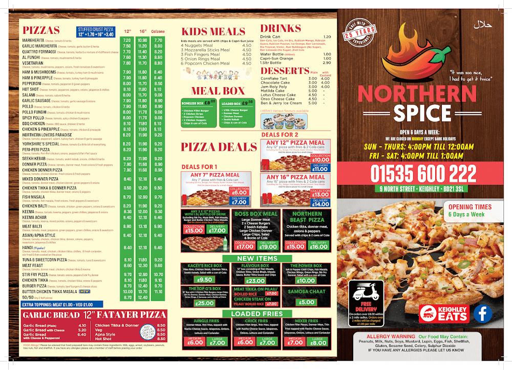 Northern Spice boasts a prime location in Keighley at 9 North St, BD21 3SL. The takeaway restaurant thrives in a bustling community environment where good food is cherished. Known for its friendly staff and prompt service, it caters to everyone, particularly those looking for late-night eats or simple dinners after a long day. The place has gained a loyal following that appreciates the generous portions and diverse menu.